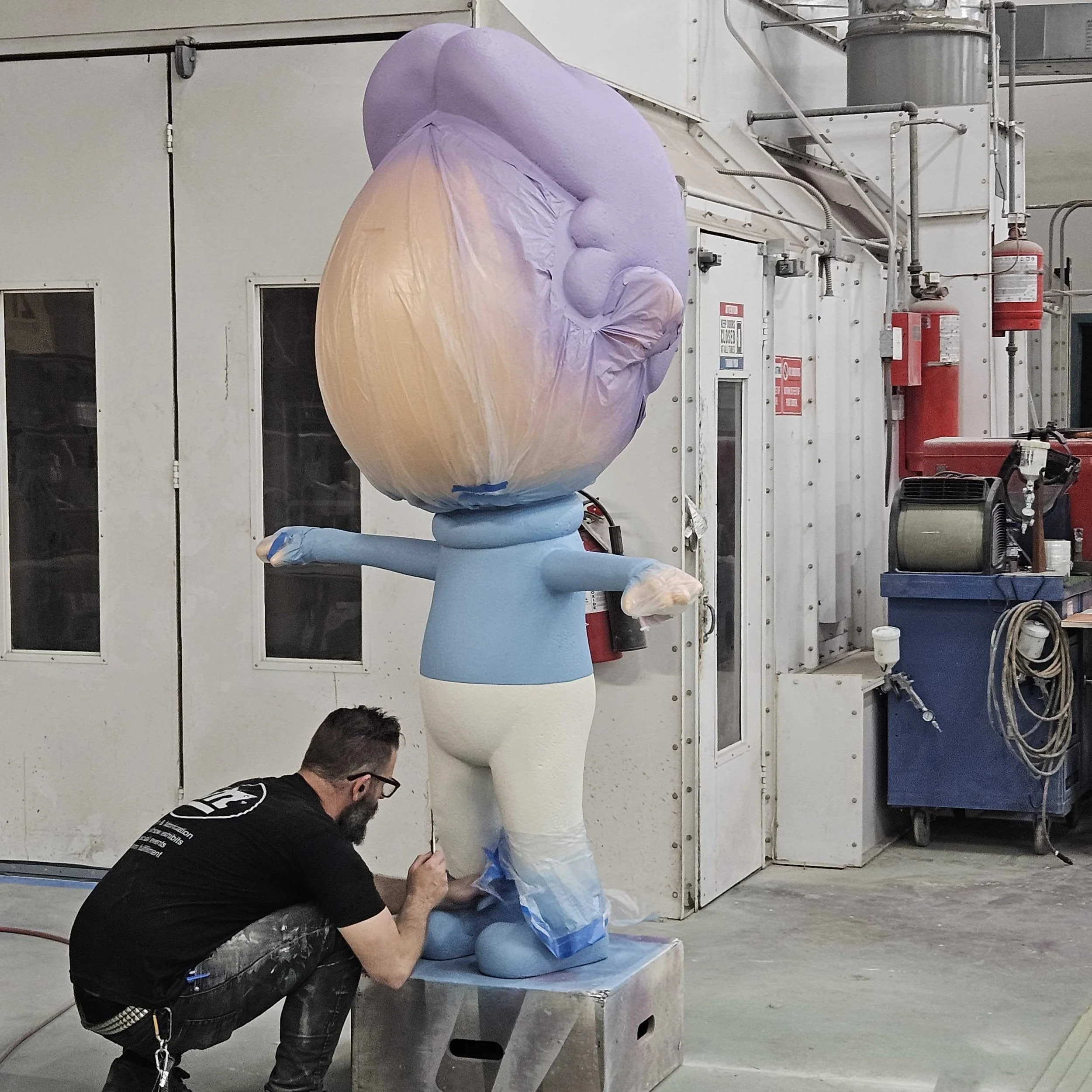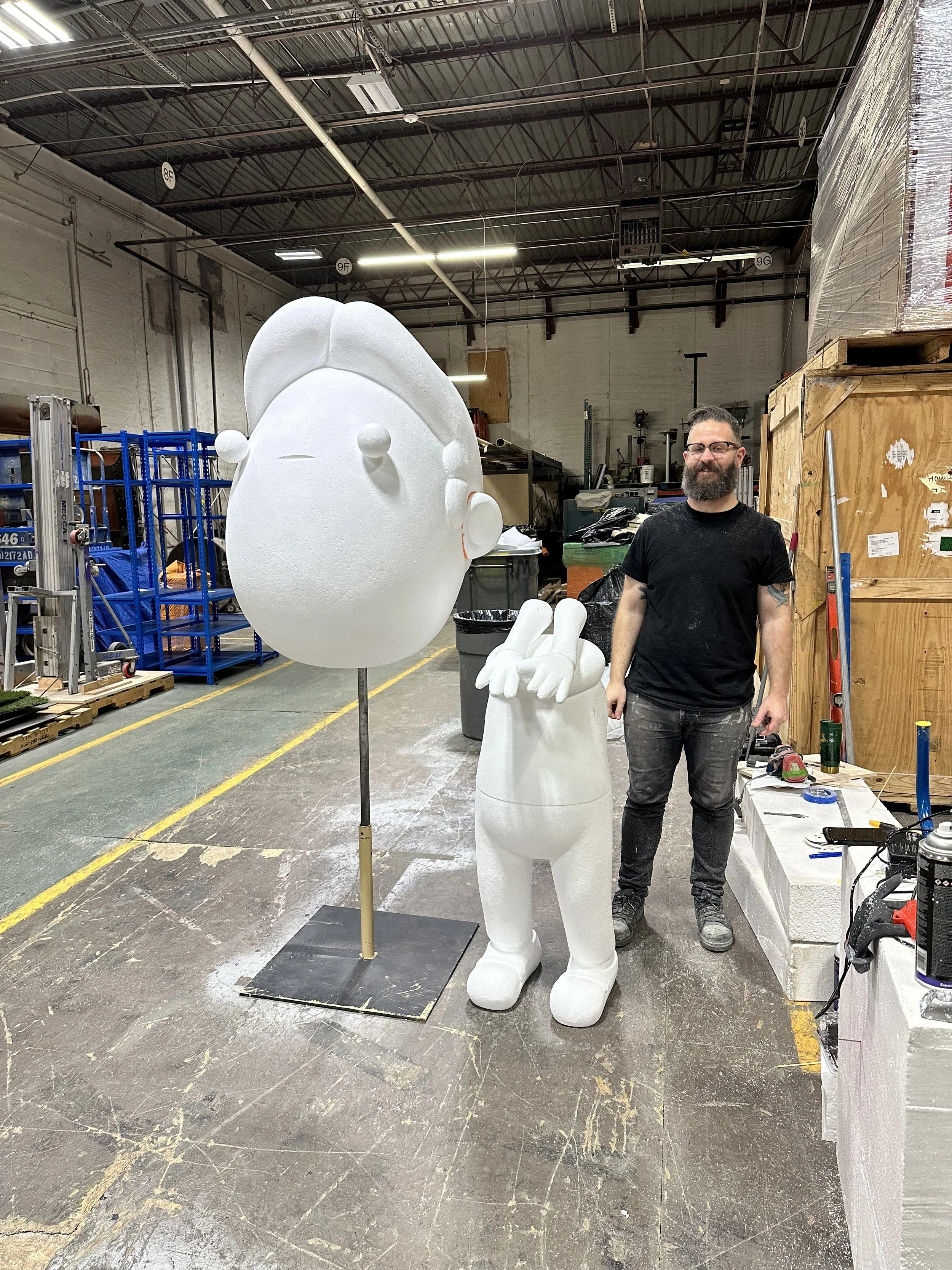 We went with a material that’s light, versatile, and perfect for bold characters: custom-sculpted foam. Starting with the basic shape of the mascot, our team carved, sanded, and refined until the figure had the right personality — oversized head, expressive features, and a stance that matched the playful vibe of Flugtag.