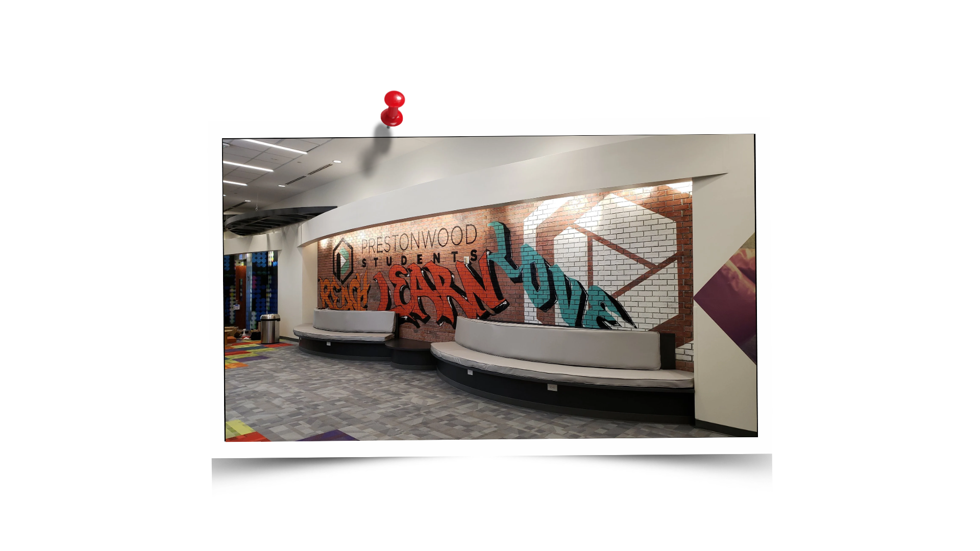Prestonwood Baptist Church is a very large community building with many different areas for people to gather and enjoy. We have worked on many projects for them in the past but most recently the bookstore, children’s bookstore, and student center. We fabricated ten giant books for the children’s area, which were foam sculpted on the CNC router and painted to achieve an aged patina with gold, embossed titles. The entrance signage and canopy, custom planters, and front of store bible bookshelves and setting were created to with darker wood to bring in an upscale, warm, library feel.
